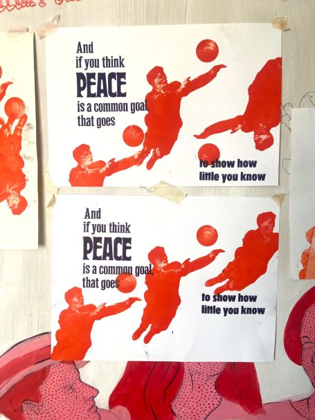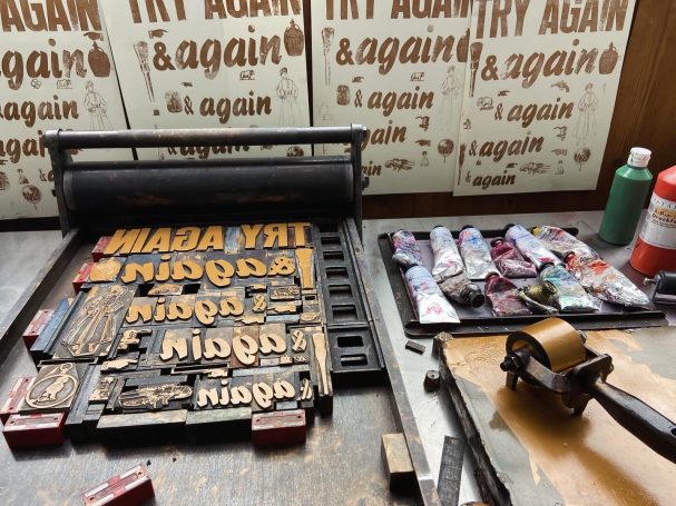 Den Buchdruck nutze ich spielerisch mit Bleibuchstaben Klischees und Holzbuchstaben für Plakate und Postkarten, Ein Zusammenspiel von Buchdruck, Linol- und Holzschnitt. Dre Druckprozess bleibt sichtbar und ist Teil der Arbeit.